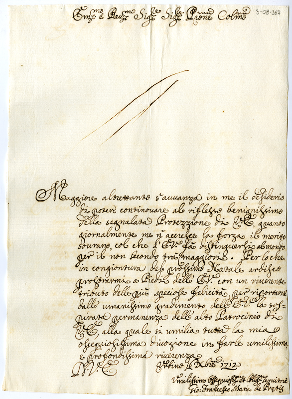 Lettera di Giovanni Francesco Maria de Pretis al cardinale Annibale Albani (1712 dicembre 16)