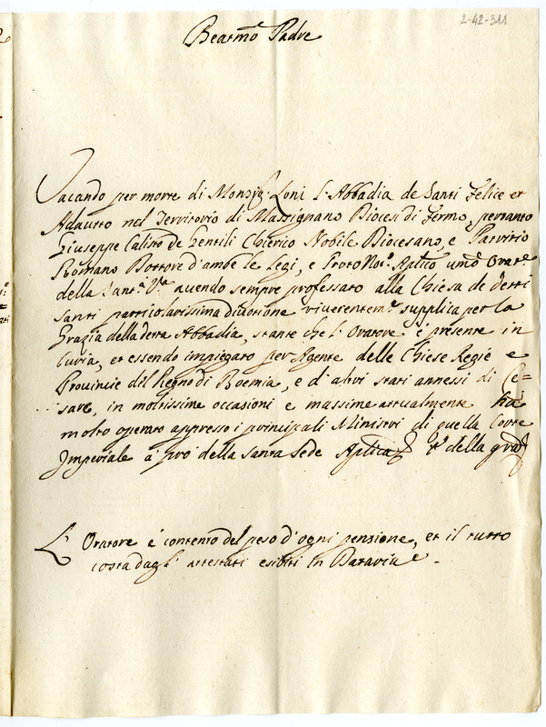 Lettera di Callisto de Gentili chierico di Fermo a papa Clemente XI (1700-1721)