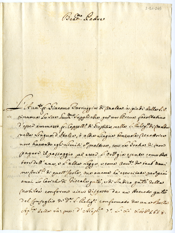 Lettera dell'avvocato Giacomo Tarruggia di Malta a papa Clemente XI (1700-1721)
