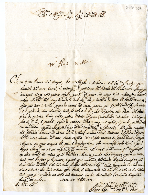 Lettera di Filippo Ligi della compagnia di Gesù al cardinale Annibale Albani (1715 dicembre 24