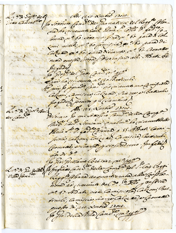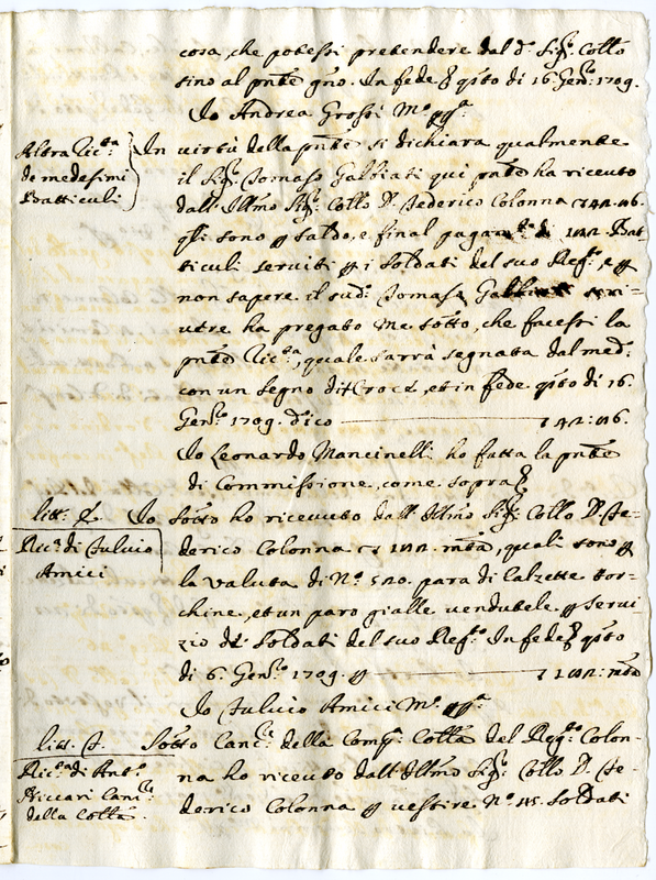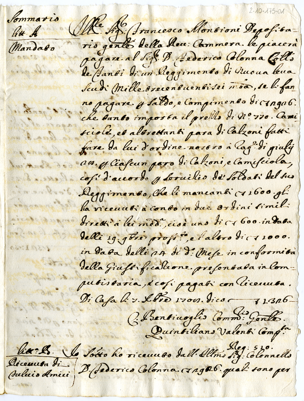 Lettera di Bentivoglio Commissario Generale dell'Armi e di Quintigliano Valenti a Francesco Montioni (1709)