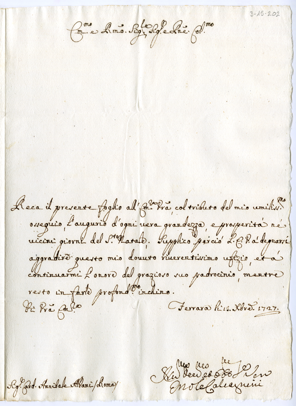 Lettera di Ercole Calcagnini al cardinale Annibale Albani (1727 dicembre 13)