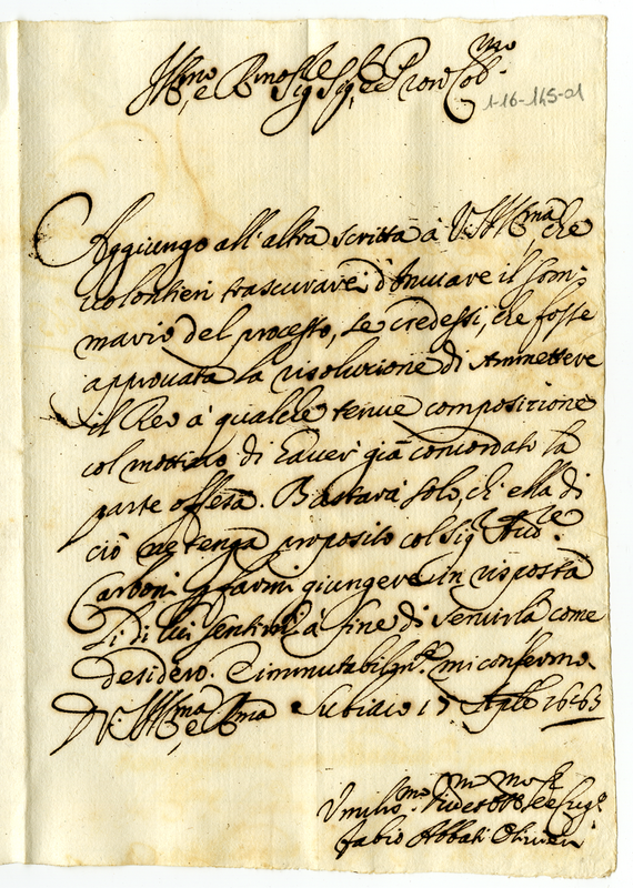 Lettera di Fabio Olivieri degli Abbati a Giovanni Francesco Albani (1685 aprile 17)