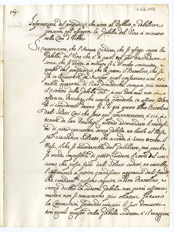 Informazione del pregiudizio, che viene al Pubblico, e Gabelliere presente nell'essiggere la Gabella del Vino a minuto nella città d'Urbino (1700-1721)