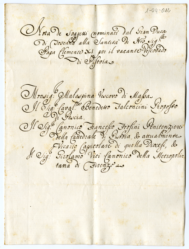Nota de' soggetti nominati dal Gran Duca di Toscana alla Santità di nostro Signore Papa Clemente XI per il vacante vescovado di Pistoia