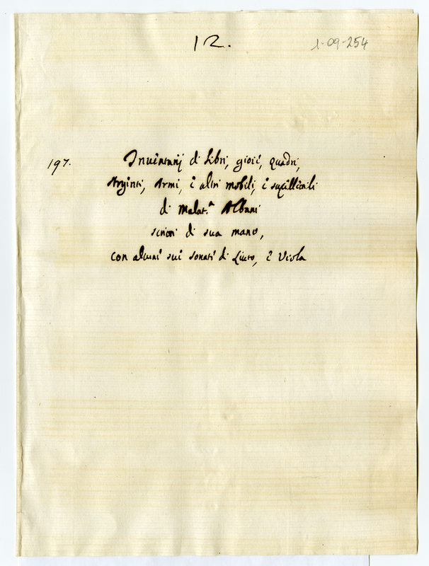 Inventari di libri, gioie, quadri, argenti, armi, e altri mobili, e supellettili di Malatesta Albani scritti di sua mano, con alcune sue sonate di Liuto, e Viola