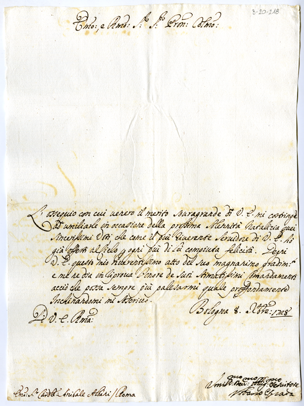 Lettera di Urbano Spada al cardinale Annibale Albani (1728 dicembre 8)