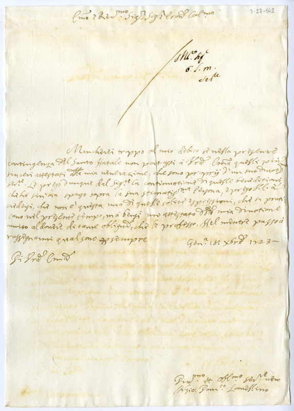 Lettera di Giovanni Domenico Lomellino al cardinale Annibale Albani (1723 dicembre 18)