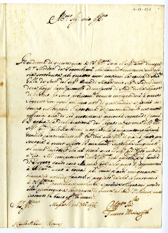Lettera di raccomandazione a favore di Giuseppe Maria Modesti di Urbino