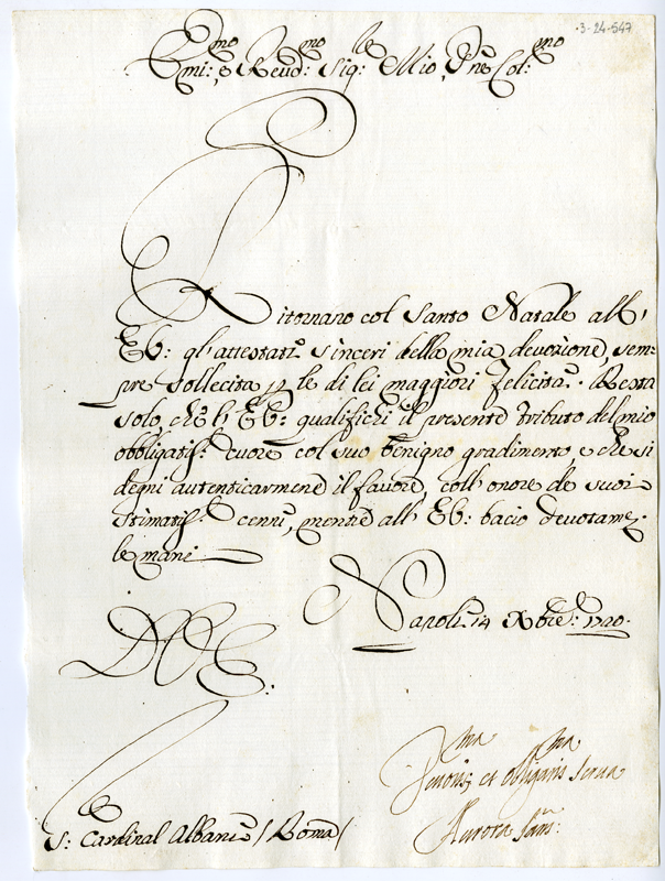 Lettera di Aurora Sansovino al cardinale Annibale Albani (1720 dicembre 14)