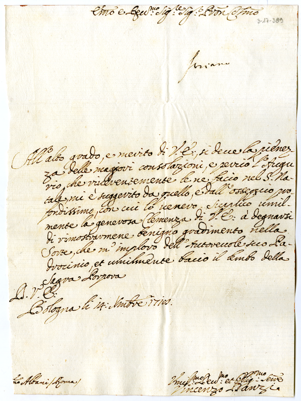Lettera di Vincenzo Danzi al cardinale Annibale Albani (1718 dicembre 14)