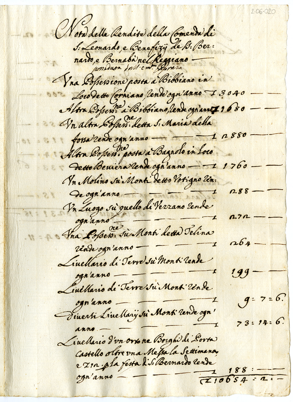 Abbazie, e Beneficii con loro rendita posseduti dalla chiara memoria dell'Eminentissimo Signor Cardinale Caprara nel Reggiano (1706-1711)
