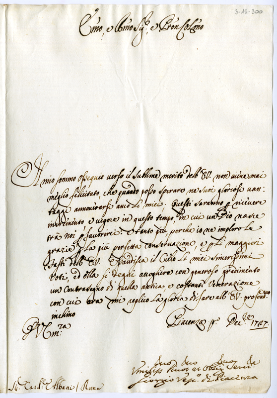 Lettera di Giorgio vescovo di Piacenza al cardinale Annibale Albani (1727 dicembre 1)