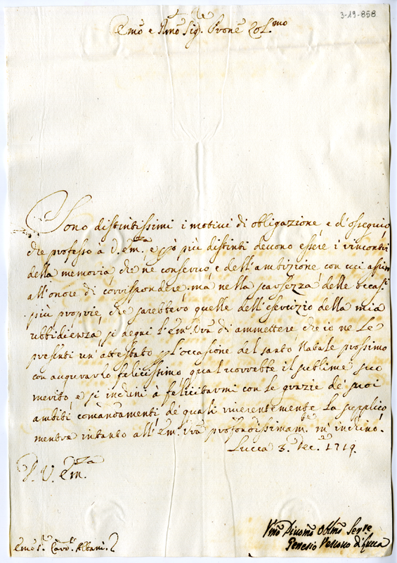 Lettera di Genesio vescovo di Lucca al cardinale Annibale Albani (1719 dicembre 3)