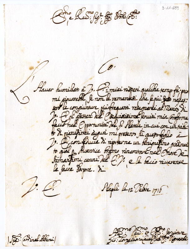 Lettera di Giovanni Toroglioni al cardinale Annibale Albani (1716 dicembre 12)