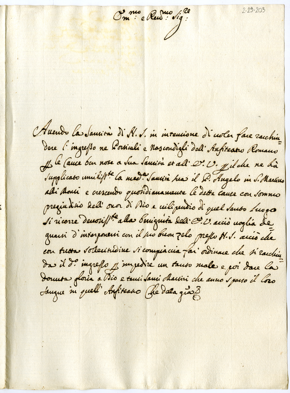 Chiede al cardinale di interporre i suoi uffici presso il pontefice affinchè faccia chiudere l'ingresso dell'anfiteatro romano