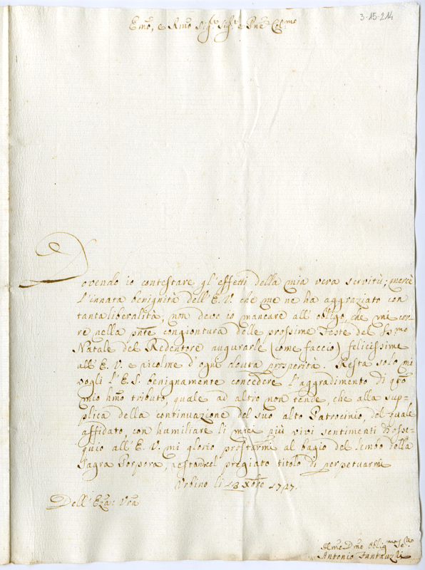Lettera di Antonio Fantauzzi al cardinale Annibale Albani (1727 dicembre 13)