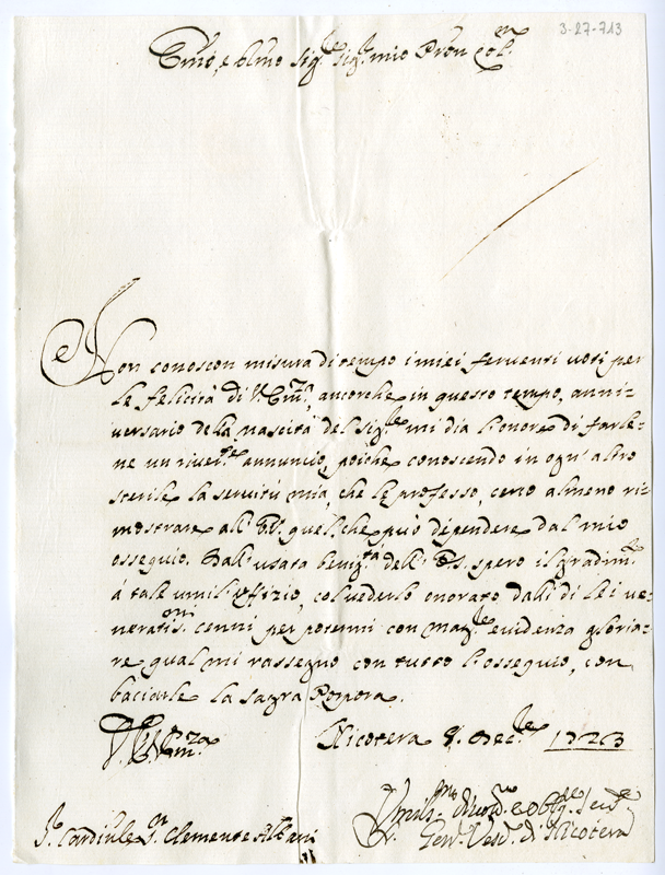 Lettera del vescovo di Nicotera al cardinale Annibale Albani (1723 dicembre 8)
