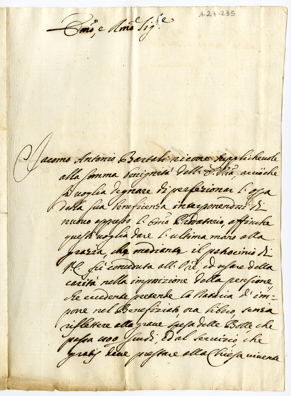 Lettera di Iacomo Antonio Bartali al Cardinale Cavallerini (1695-1699)