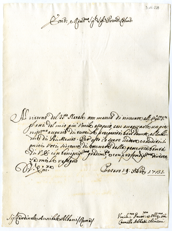 Lettera di Camilla Abbati Olivieri al cardinale Annibale Albani (1731 dicembre 19)