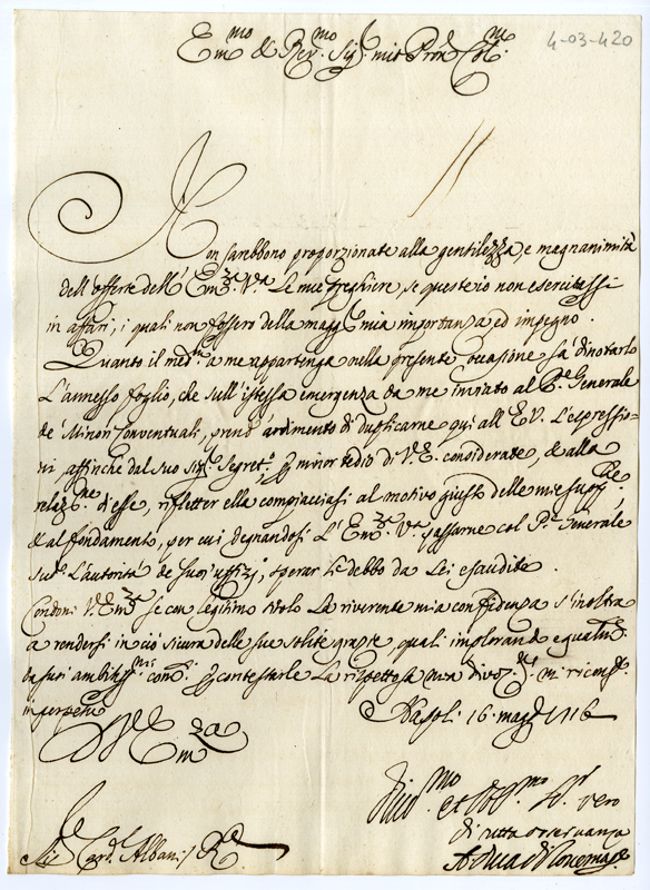 Lettera del Duca di Rovemage al Cardinale Annibale Albani (1716 maggio 16)