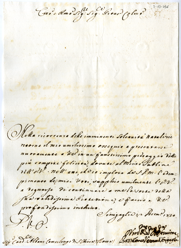 Lettera di Bartolomeo vescovo di Senigallia al cardinale Annibale Albani (1730 dicembre 12)