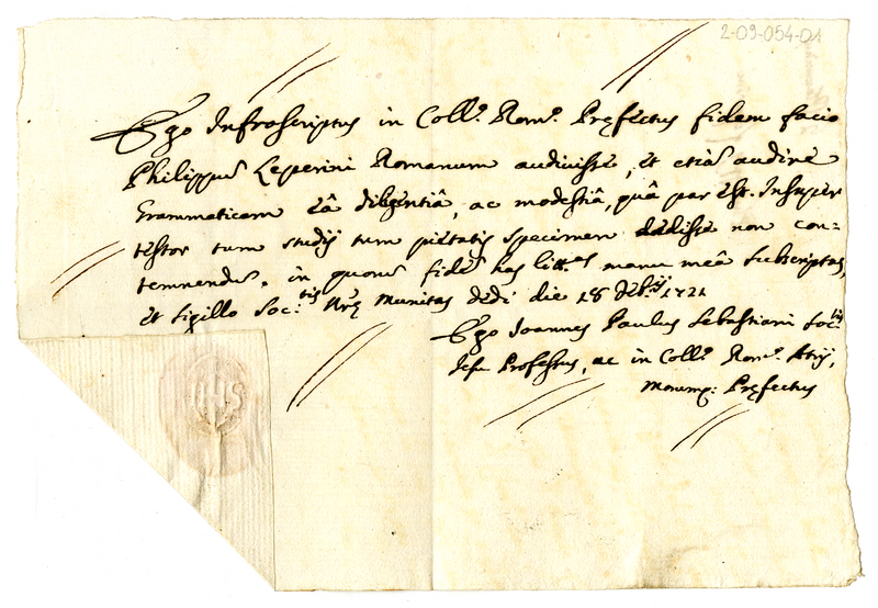 Attestato in favore di Liparini Filippo rilasciato da Giovanni Poalo Sebastiani del Collegio Romano (1721 febbraio 18)