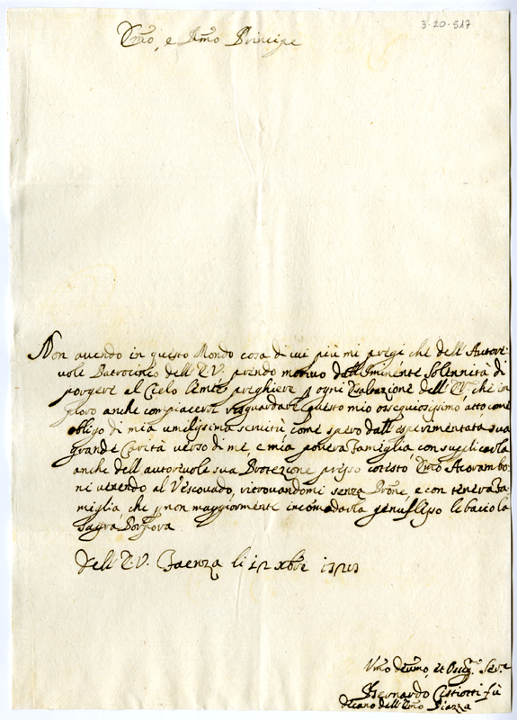Lettera di Bernardo Cistiotti al cardinale Annibale Albani (1728 dicembre 12)