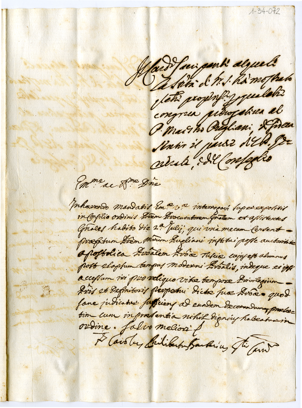 Lettera di frate Carlo Chiliberto Barberi a un cardinale (1700-1721)