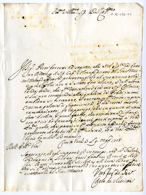 Comunica il dispiacere del priore Ferretti per essere stato discriminato nei confronti del capitano Colonna e mostra la convenienza di rimediare