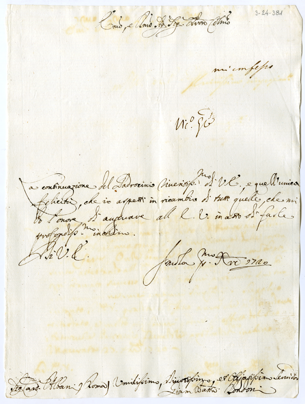 Lettera di Giambattista Rondoni al cardinale Annibale Albani (1720 dicembre 1)