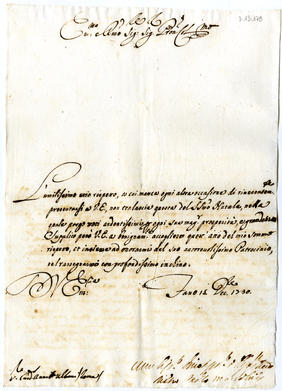 Lettera di Pietro Paolo Marcolini al cardinale Annibale Albani (1730 dicembre 15)
