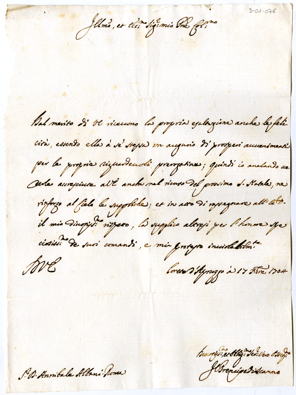 Lettera del principe di Scanno ad Annibale Albani (1704 dicembre 17)
