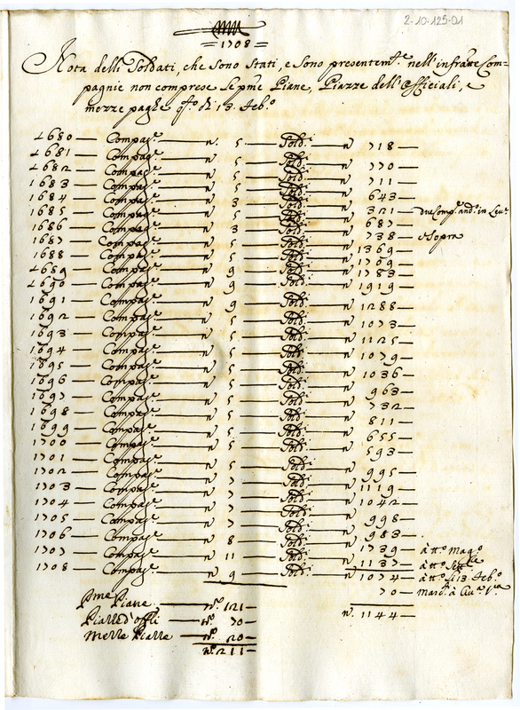 Nota delli soldati che sono stati e sono presentemente nell'infrascritte compagnie non comprese le prime Piane, Piazze dell'Officiali e mezze paga questo di 13 febbraio 1708