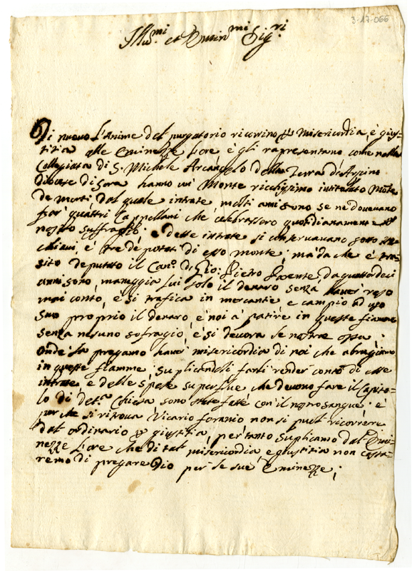 Denuncia degli appartenenti della collegiata di San Michele Arcangelo della terra di Arpino diocesi di Sora a nome delle anime del Purgatorio contro il canonico Giovanni Pietro Parente. Il ricchissimo Monte dei Morti da lui amministrato non fa più suffragi (1700-1721)