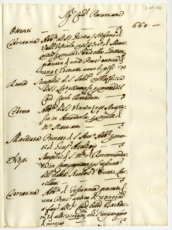 | bo.livello.titolo2 | Archivio Albani|"Proviste di beneficii ecclesistici, e pensioni fatte da Papa Clemente XI. Alli suoi familiari: alli cardinali da lui creati, et ad altri, creature de' sommi pontefici antecessori; com'ancora a' varie sorti di persone meritevoli. Con le note, e memorie di proviste fatte dagli altri pontefici. 1"|"Proviste de Signori Cardinali creati nuovamente; nelle quali non è tirata fuori la somma delle Abbadie"|Documenti contenuti | |