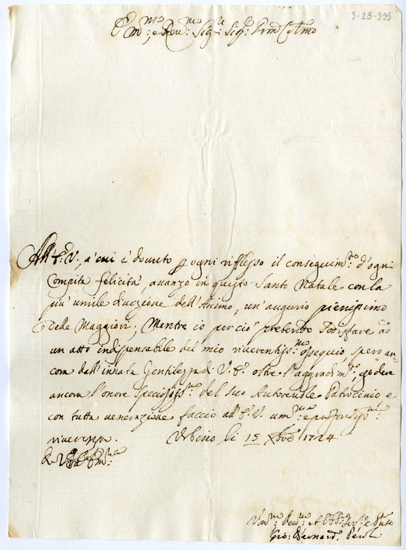 Lettera di Giovanni Bernardino Peroli al cardinale Annibale Albani (1724 dicembre 15)