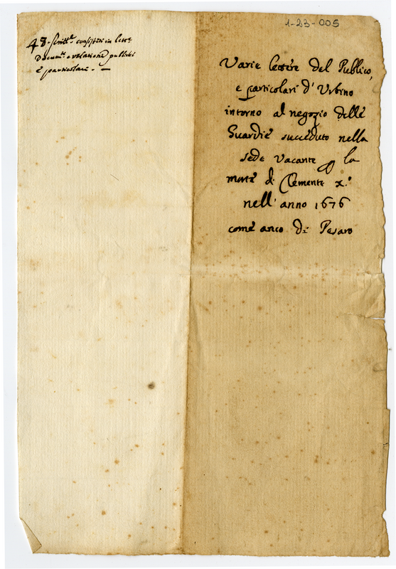 Varie lettere del pubblico, e particolari d'Urbino intorno al negozio delle Guardie succeduto nella Sede Vacante per la morte di Clemente X nell'anno 1676 come anco di Pesaro