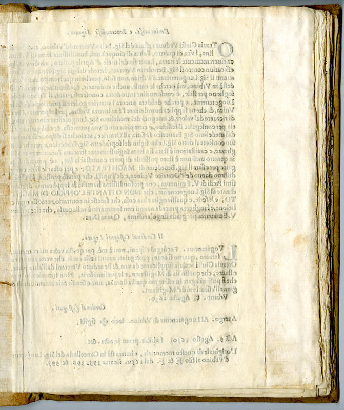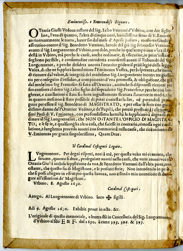 Atti per la causa pecuniaria intentata da Ottavia Giusti vedova del Signor Lelio Veterani di Urbino contro il Signor Benedetto Veterani erede del già Francesco Veterani (1650-1660)