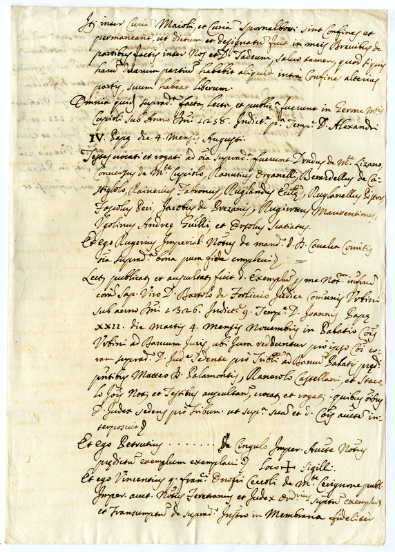 4. Copia dell'istrumento stipulato in Gerone di Monte Copiolo il 4 d'agosto 1258 contenente la divisione dei feudi e beni stabili fatta dal famoso Cavalca conte. Istrumento fatto dal notaio imperiale Ruggero