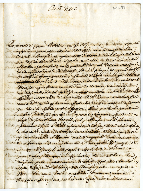 Lettera di Pontiano Fargna alla Santità di Papa Alessandro VIII (1689-1691)