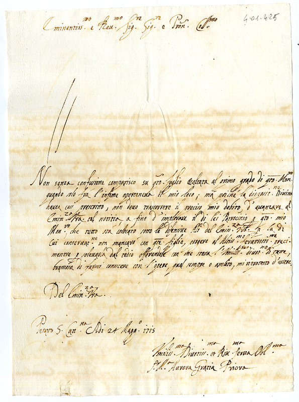 Lettera di suor Maria Aurora Grazia Priora al Cardinale Albani (1715 maggio 24)