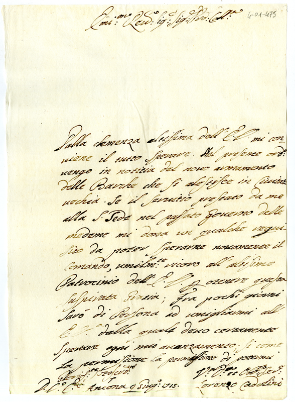Lettera di Lorenzo Cadolini al Cardinale Annibale Albani (1715 giugno 9)