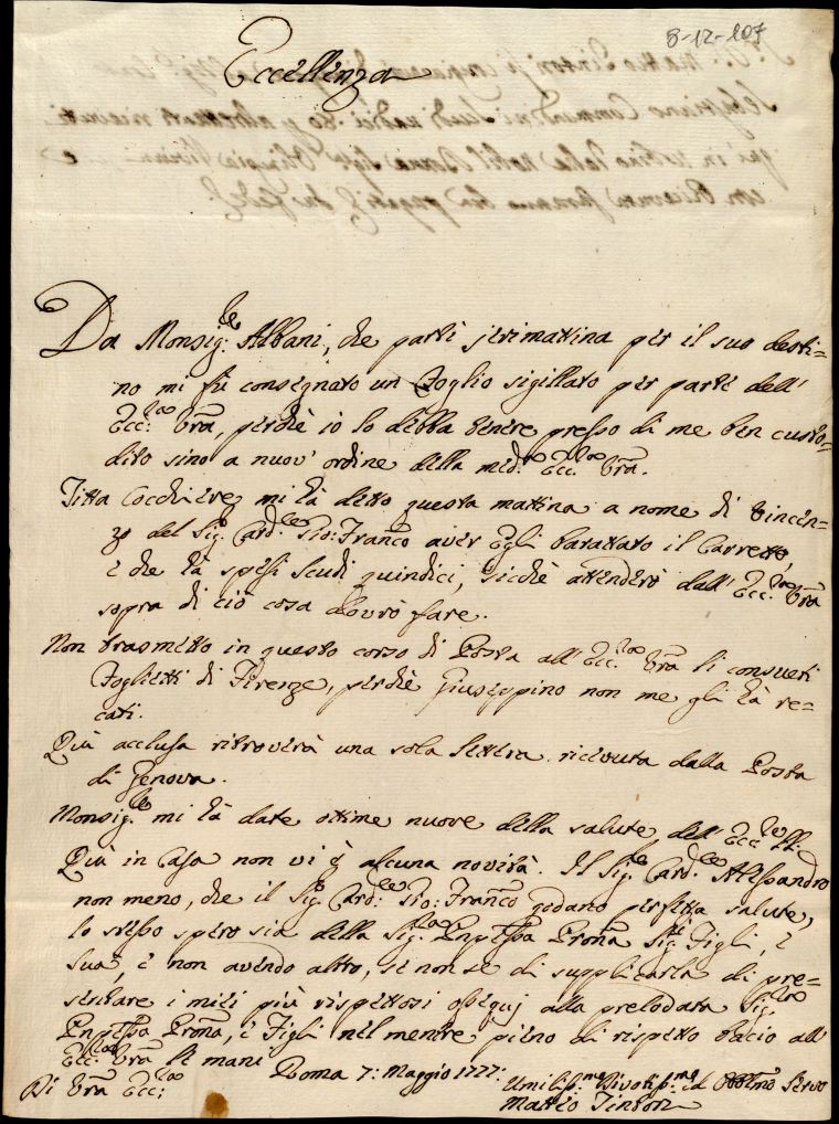 Lettere ricevute in Urbino nella permanenza in Urbino nei mesi di maggio, giugno e luglio 1777