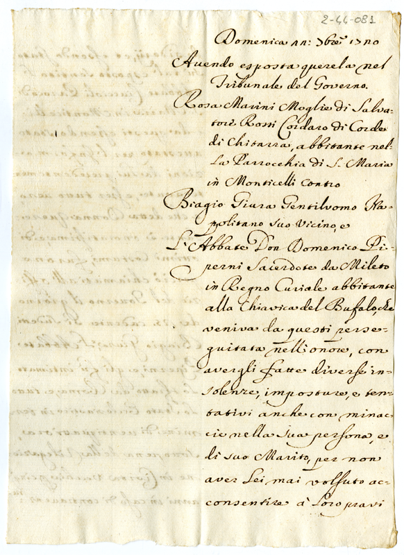 Querela di Rosa Marini moglie di Salvatore Rossi contro Biagio Giura e contro l'abate don Domenico Piperni per diverse insolenze, imposture e minacce dovute a non avere consentito ai loro pravi desideri. Intimazione a Biagio Giura e all'abate Piperni di abbandonare Roma e lo Stato Ecclesiastico entro 24 ore