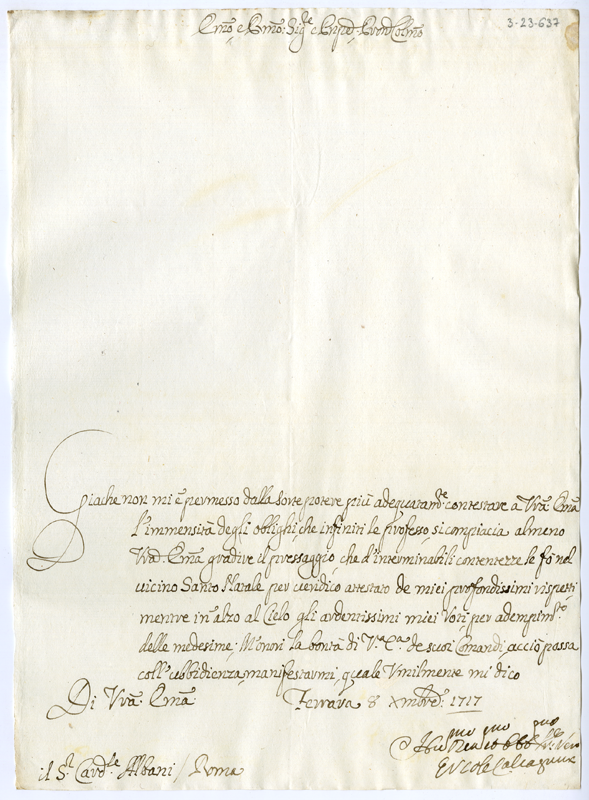 Lettera di Ercole Calcagnini al cardinale Annibale Albani (1717 dicembre 8)