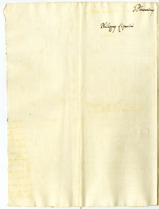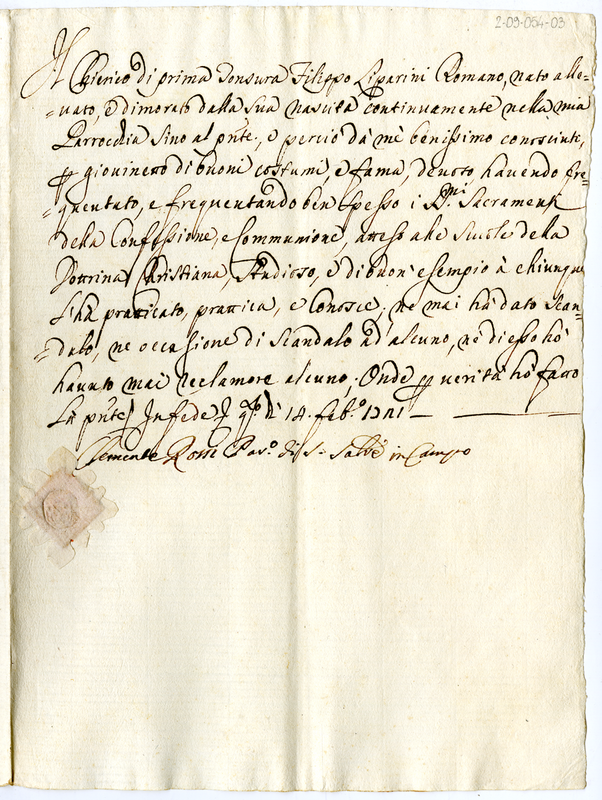 Attestato di buoni costumi rilasciato da Clemente Rossi a favore di Filippo Liparini (1721 febbraio 14)