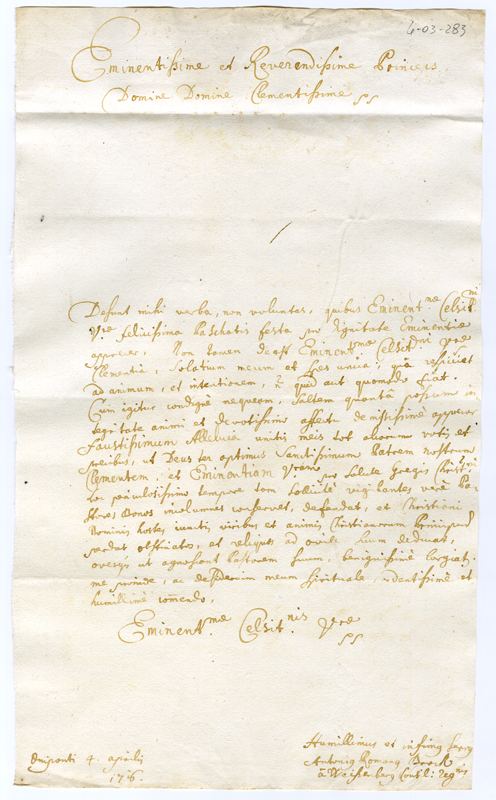 Lettera di Antonio Romano Brock al Cardinale Annibale Albani (1716 aprile 4)