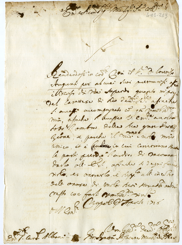 Lettera di Giovanni Battista Pisacane al Cardinale Annibale Albani (1716 aprile 1)