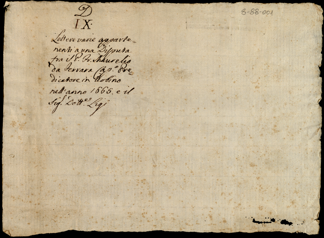 Lettere varie appartenenti a una disputa fra il padre francescano Maurelio da Ferrara capitano predicatore in Urbino nell'anno 1665 e il signore dottore Ligi